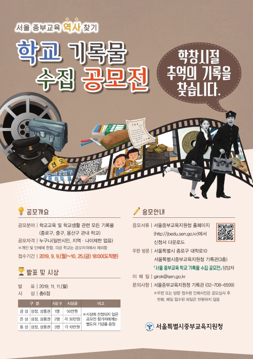 수집하는 기록물은 ▲학교교정·수업시간 ▲소풍 ▲운동회·체육대회 ▲입학식· 졸업식 ▲입시관련 등 학창시절 추억의 사진 기록물 ▲교무일지 ▲교원증 ▲봉급표·봉급봉투 등 교직생활 기록물 등 종로구와 중구, 용산구 소재 학교와 관련된 학창시절 또는 교직생활의 소중한 추억이 담겨있는 물건들이다.