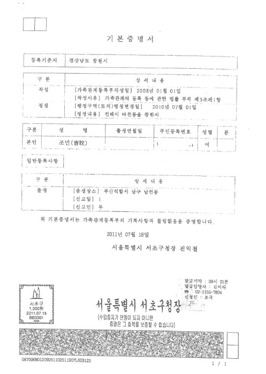 이 서류는 2011년 7월18일 서울 서초구청에서 발급됐으며 신청자는 '조국'으로 표기돼있다.