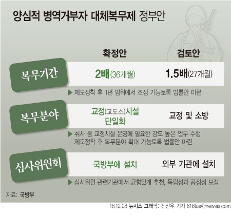 이미지 확대보기'병역거부 대체 입법'은 헌법재판소가 지난해 6월 '종교적 신념' 등에 따른 대체복무를 병역종류로 규정하지 않은 현행 병역법 5조 1항에 대해 '헌법불합치' 결정을 내린 데 따른 것이다. 당시 헌재는 개정 시한을 올해 12월 31일로 정한 바 있다.