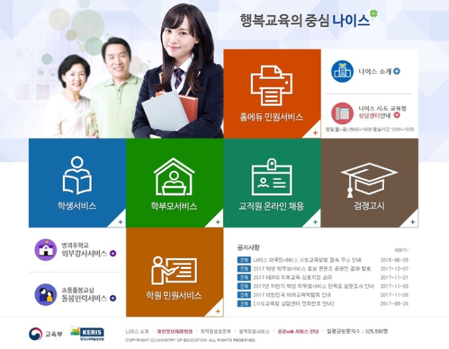 교육행정 정보를 처리하는 '나이스'(NEIS)는 교육청과 학교 등 행정 업무를 전자적으로 연계 처리하는 시스템이다. 학부모는 나이스 홈페이지에서 자녀의 학교생활 정보와 학생부, 성적표, 출석 등도 확인할 수 있다.