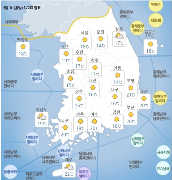 17일까지 중국 북부지역에서 동해로 오는 고기압과 18일의 중국 북부지역 고기압 영향으로 연달아 맑은 날씨를 유지하겠다.
