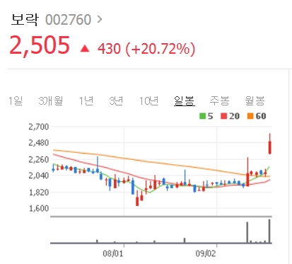 지난해 매출은 340억 정도다. 한편 이날 주가는 전날보다 20% 급등 2505원에 거래되고 있다.