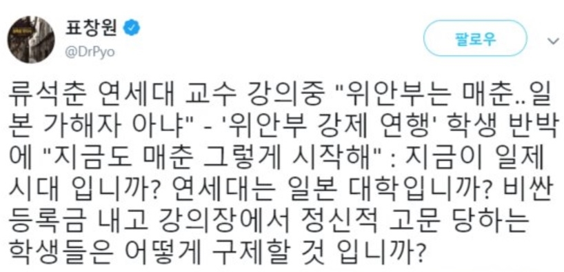 류 교수는 지난 19일 연세대 사회학과 전공과목 ‘발전사회학’ 강의 도중 “(위안부 관련) 직접적인 가해자는 일본(정부)이 아니다”라며 “(위안부는) 매춘의 일종”이라고 말했다.