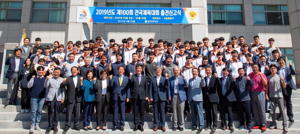 인하대(총장‧조명우)는 지난 23일 인하대 본관 앞에서 운동부를 비롯해 학교 관계자, 인천시체육회 관계자 등과 함께 100회 전국체육대회 출전선고식을 가졌다.