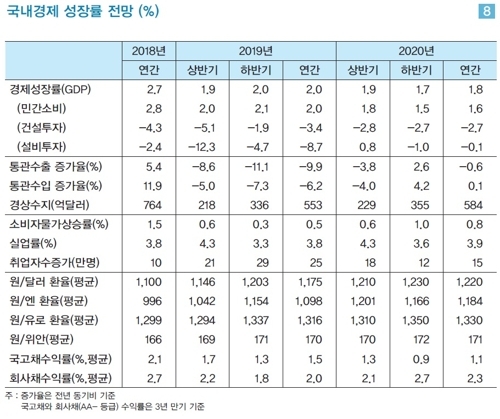 연구원은 올해 성장률을 지난 4월 전망치인 2.3%에서 2.0%로 내리면서 2020년은 이보다 낮은 1.8%에 그칠 것으로 예상했다.