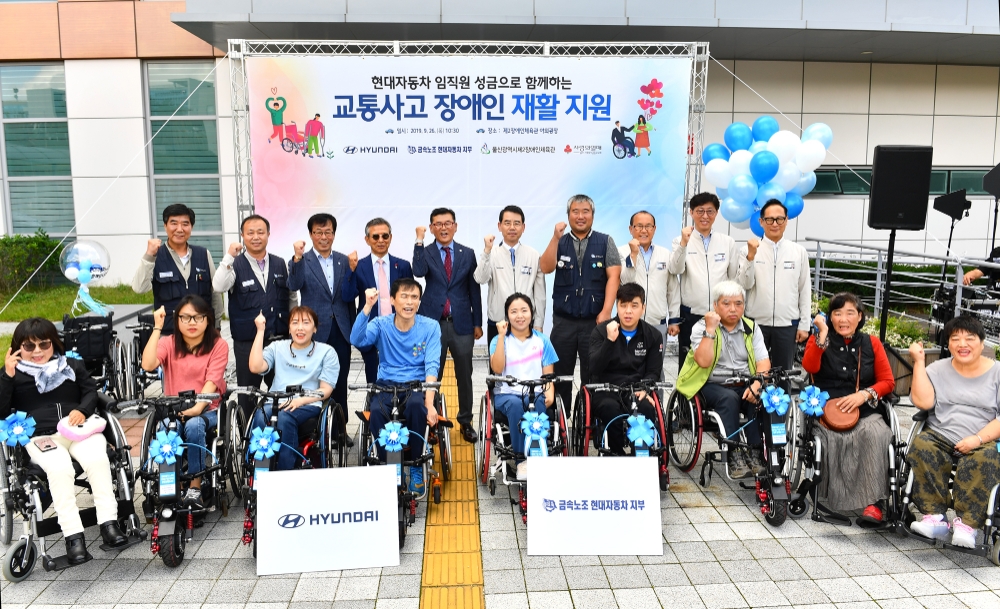이미지 확대보기현대차 노사는 26일 울산시제2장애인체육관에서 교통사고 피해 장애인 재활지원 기금 9763만9740원을 울산사회복지공동모금회와 울산시제2장애인체육관에 전했다.