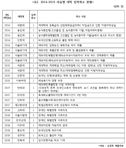 취소 유형별로 보면 ▲재외국민 특별전형 허위 자료 제출 6건 ▲장애인 특별전형 서류위조 5건 ▲외국인 전형 허위 학력·서류 제출 3건 ▲계약학과 계약체결 취소 3건 등 이었다. 주로 특별전형에서 부정행위가 발각돼 입학이 취소됐다.