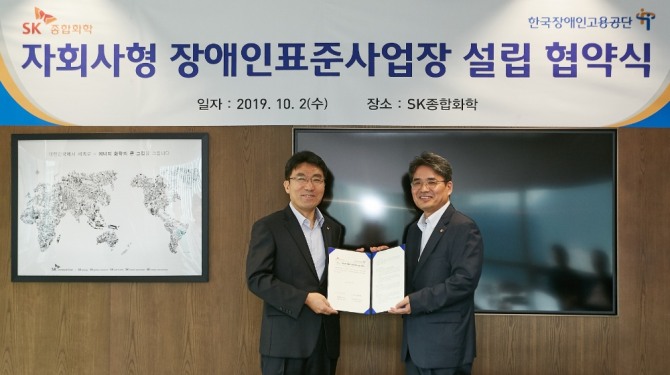 이미지 확대보기SK종합화학은 2일 한국장애인고용공단과 SK종합화학 본사에서 ‘자회사형 장애인표준사업장 설립’ 업무협약(MOU)를 체결했다고 밝혔다.