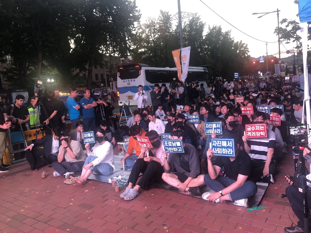 대학생연합은 시국선언문을 통해 "국민 대다수가 조 장관과 관련된 범죄 의혹에 경악하고 있음에도, 조 장관은 수사에 간접적으로 개입하고 진심 어린 사죄나 사퇴 의지를 보이지 않았다"며 "권력형 적폐를 청산하고 정의로운 결과를 약속한 문재인 정권은 이를 옹호하고 있다"고 비판했다.