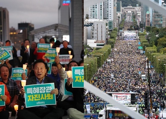 그렇다면 조국 반대 시위를 하는 보수 야당의 광화문 집회에 등장한 '촛불'은 어떤 의미일까. 5일 광화문 집회에서 바른미래당 손학규 대표(위 사진 왼쪽)를 비롯한 집회 참가자들은 촛불을 들었다. 촛불이 광화문 시위에서, 특히 의미있는 상징성을 가졌던 시점은 지난 2016년 최순실 국정 농단에 반발한 광화문 '박근혜 하야' 요구 범국민 촛불집회 때다. 당시 바른미래당은 집권당이었고 촛불을 들수 없었다. 그런 바른미래당이 5일 집회에선 촛불을 들었다. 3일 개천절에 열린 조국 법무부 장관 사퇴 촉구 광화문 집회에서는 '문재인 하야' 같은 피켓도 등장했다. 이로 미뤄볼 때 5일 바른미래당의 광화문 '촛볼' 시위는 문재인 대통령이 임명한 '조국 사퇴'를 박근혜 전대통령을 하야시킨 바로 그당시, 바로 그자리에서 있었던 촛불혁명과 결부시키려는 것으로 해석할 수도 있다.