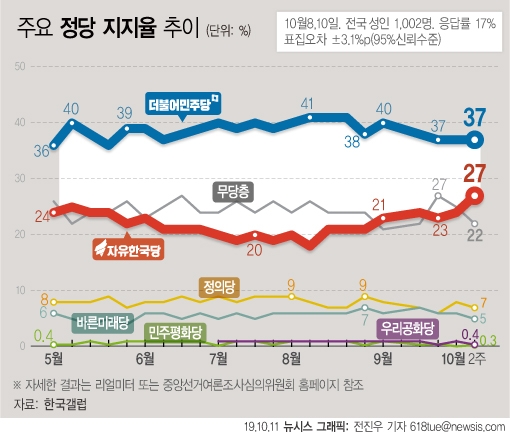11일 여론조사 전문기관 한국갤럽은 최근 10월 2주차(8, 10일) 지지 정당 조사를 실시했다. 그 결과 민주당 37%, 한국당 27%, 정의당 7%, 바른미래당 5%, 우리공화당 0.4%, 민주평화당 0.3% 순으로 나타났다. 특정 정당을 지지하지 않은 이들은 22%에 달했다.