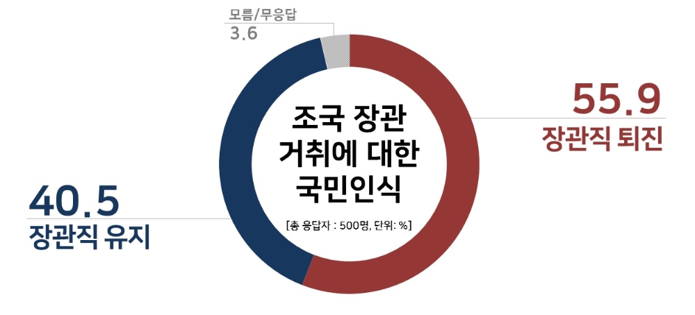 조사 결과, 장관직에서 '물러나야 한다'는 응답이 55.9%, '유지해야 한다'는 답변은 40.5%로 오차범위(±4.4%p) 밖인 15.4%포인트 차이를 보였다.