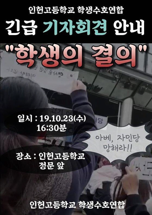인헌고 학생수호연합은 이날 오후 4시30분 인헌고 정문 앞에서 학생 결의 기자회견을 개최했다.