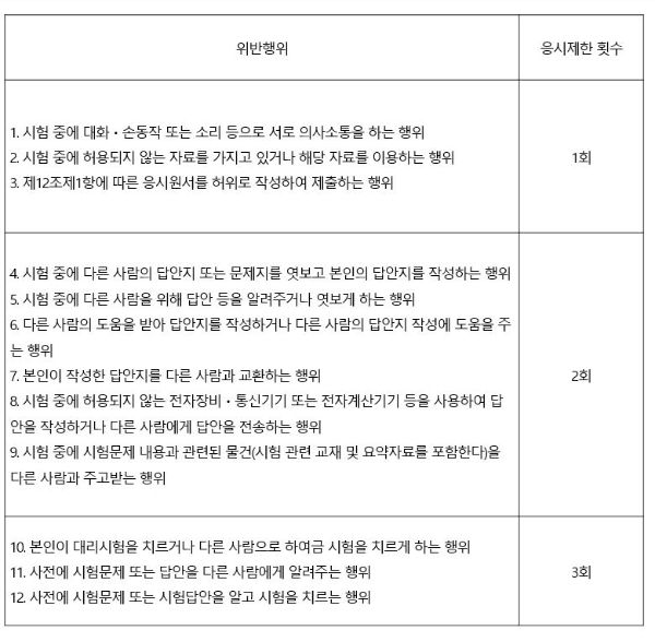 이를 구체적으로 보면 ▲1회 제한은 시험 중 의사소통 행위, 자료 이용 행위, 응시원서 허위 제출 ▲2회 제한은 다른 사람의 답안지나 문제지를 엿보거나 알려주는 등 답안 작성에 직접적으로 도움을 주거나 받을 경우 ▲3회 제한은 대리시험, 사전에 시험문제나 답안 유출 등이다.