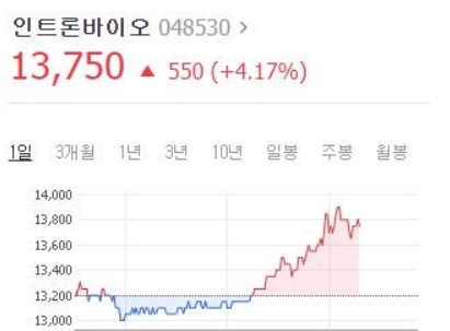 인트론바이오 주가가 13일 6.44% 올라 1만 4050원에 거래를 마쳤다.