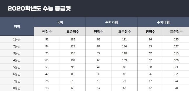15일 EBS와 입시기관이 공개한 '2020학년도 수능 영역별 등급컷' 가채점 결과에 따르면 국어영역은 1등급 91점(표준점수 132점), 2등급 84점(표준점수 125점), 3등급 75점(표준점수 116점) 4등급 65점(107점), 5등급 53점(96점)이다.
