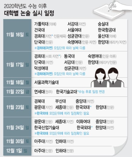 이미지 확대보기16~17일부터는 대학별 수시 논술, 22일부터는 면접고사가 각각 시작된다.