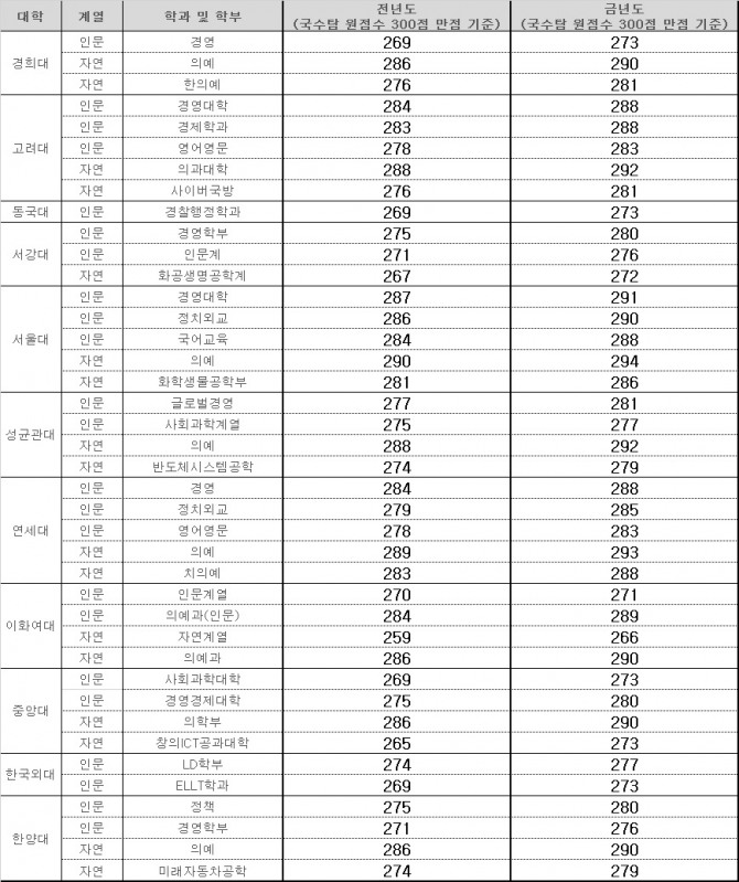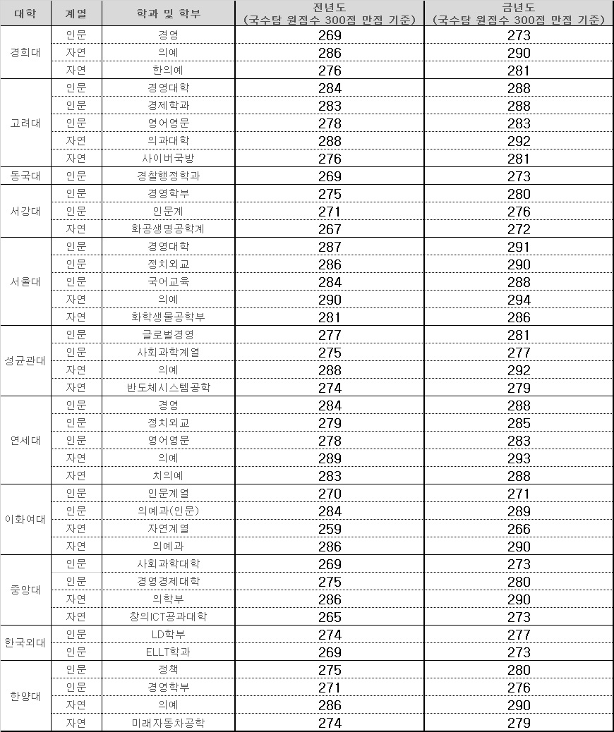 이밖에 고려대 경영학과 288점, 고려대 경제학과 288점, 서울대 국어교육학과 288점, 서울대 화학생물공학과 286점, 연세대 경영학과 288점, 연세대 정치외교학과 285점 등도 280점 후반대로 예상했다.