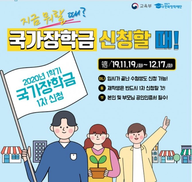 신청 대상은 신‧편입생‧재학생‧재입학생‧복학생으로, 한국장학재단 누리집(www.kosaf.go.kr)과 앱을 이용해 24시간 가능하다. 2020년 입학 예정인 고등학교 3학년 학생과 재수생도 신청할 수 있다.