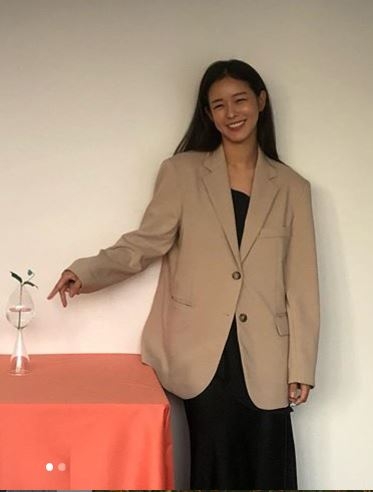 경수진은 최근 인스타그램에 하얀 꽃병을 가리키며 환하게 웃고 있다.