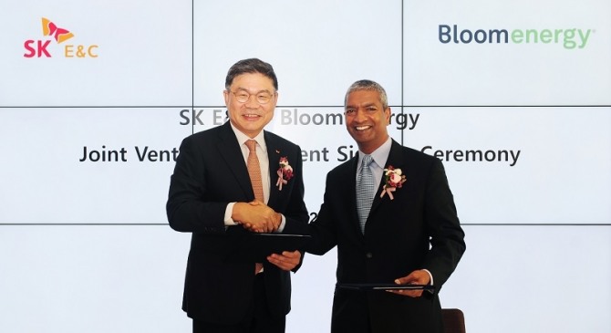SK건설은 지난 9월 서울 종로구 관훈동 본사에서 미국 블룸에너지와 고체산화물 연료전지(SOFC) 생산과 공급을 위한 합작법인(JV)과 국내 생산공장 설립에 관한 합작투자계약 체결식을 거행했다.
