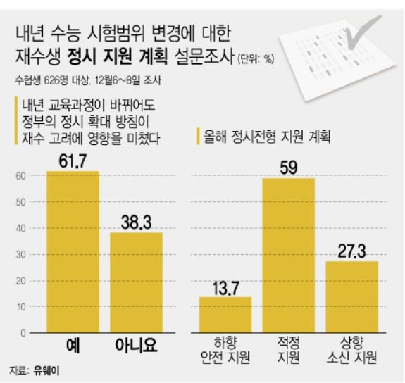 유웨이 관계자는 "이는 내년부터 2015 개정 교육과정에 의한 수능이 시행됨에도 불구하고 정부의 정시 수능 전형 확대 방침과 맞물려 수험생들은 재수(N수)에 대한 부담을 크게 느끼지 않은 것으로 보인다"고 분석했다.