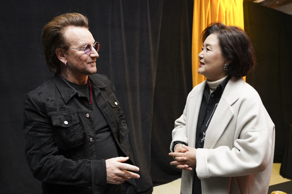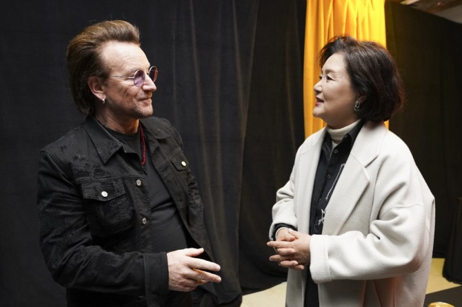 문재인 대통령 부인 김정숙 여사가 세계적인 록밴드 '유투(U2)' 보컬 보노(본명 폴 데이비드 휴슨)를 만나 "평화를 향해 가야 할 길이 멀지만 꼭 이루리라 희망한다"고 말했다.