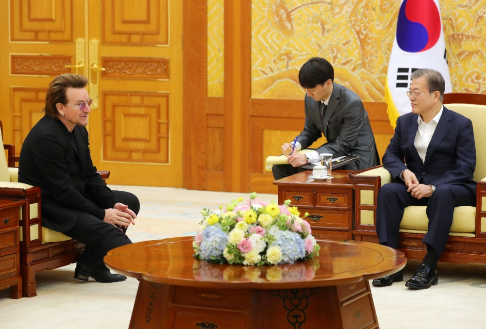문재인 대통령은 9일 세계적인 록밴드 '유투(U2)' 보컬 보노(본명 폴 데이비드 휴슨)를 만나 "어제 훌륭한 공연뿐 아니라 공연 도중에 메시지로서도 남북한의 평화와 통일을 바라는 메시지도 내주셨다"고 말했다.