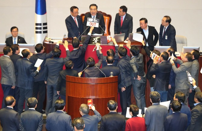 권성동 의원은 의장석에 올라와서 "어떻게 이런 일이 있을 수 있나. 사과하라"고 따졌고 이은재 의원은 삿대질을 하며 "날강도"라고 비난했다.