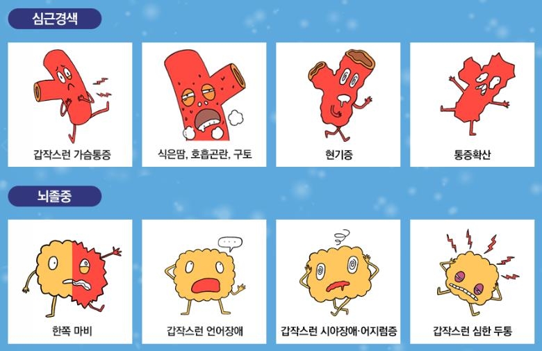 갑작스런 가슴통증이 30분 이상 지속되거나 호흡곤란과 식은땀, 구토, 현기증 등이 나타날 때는 심근경색을 의심해야 한다. 뇌졸중은 한쪽 마비, 갑작스런 언어 및 시각장애, 어지럼증, 심한 두통 등이 초기증상으로 주의를 기울여야 한다.