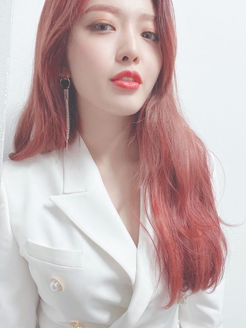 사진 속 찬미의 개성있게 연출한 빨간 머리와 천사같은 하얀 의상을 입고 있다.