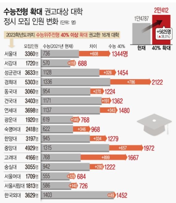 이들 대학은 2022학년도와 2023학년도 입시에서 정시모집 비율 계획을 제출해야 한다.