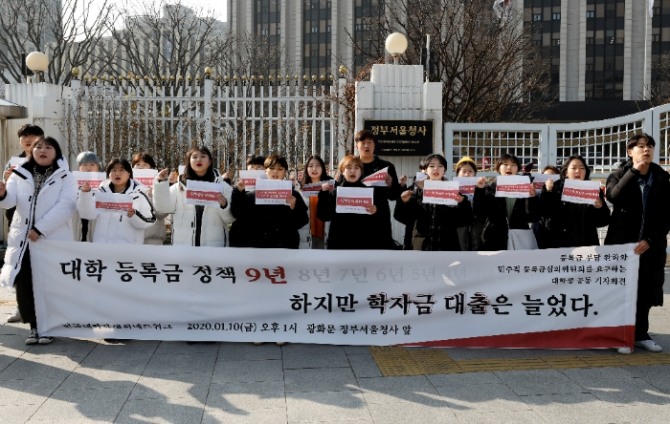 한국외대 김나현 총학생회장은 "국가장학금 제도가 마련됐어도 실제 수혜자는 절반에 불과한 상황"이라며 "경제협력개발기구(OECD) 4위, 2조 원에 가까운 학자금 대출 총액은 등록금 문제가 여전함을 보여준다"고 설명했다.