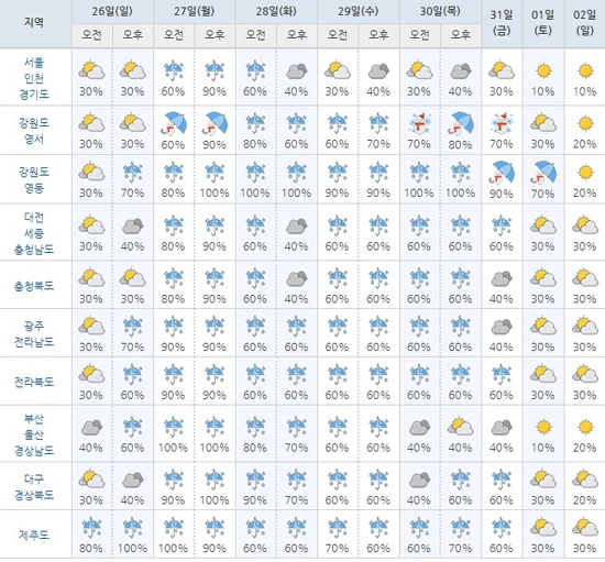 26~28일 바다의 물결은 제주도해상과 남해상, 동해상을 중심으로 최고 4미터 이상 높게 일겠으니 항해나 조업하는 선박은 유의하기 바라며, 여객선을 이용할 경우 최신의 기상 정보를 참고해야 한다.
