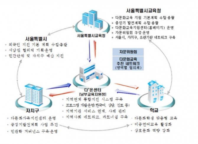 이미지 확대보기서울시교육청은 구로구와 금천구, 영등포구 등과 남부교육지원청 관내 다문화학생 밀집지역에 대한 통합 지원을 위해 '남부3구, 서울학생 동반성장 지원을 위한 중장기 발전계획(안)'을 마련했다고 30일 밝혔다.