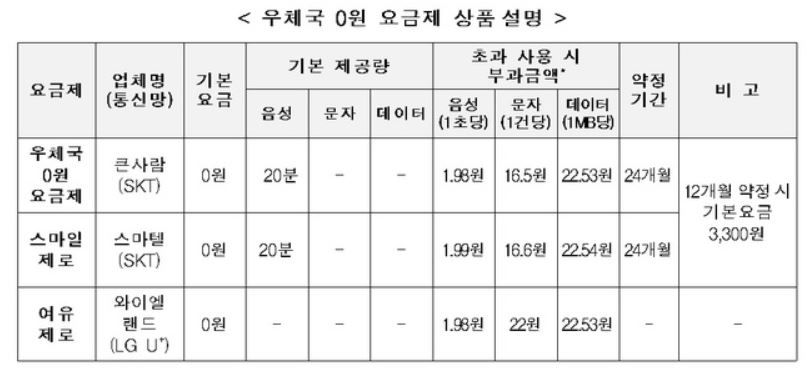 0원 요금제는 ‘우체국 0원 요금제’, ‘스마일 제로’, ‘여유 제로’ 총 3종이다. ‘우체국 0원 요금제’와 ‘스마일 제로’는 24개월 약정 시 음성통화 20분을 기본 제공하며, ‘여유 제로’는 음성통화를 기본 제공하지 않는 대신 별도의 약정 없이 이용할 수 있다.