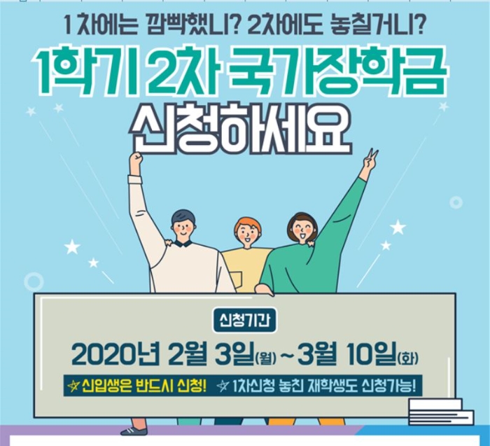신청 대상은 신입생과 편입생, 재입학생, 복학생, 1차 신청을 놓친 재학생으로 재단 누리집(www.kosaf.go.kr)과 앱을 이용해 24시간 신청 가능하다.