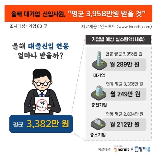 6일 취업포털 인크루트와 바로면접 알바앱 알바콜이 831개 기업을 대상으로 '2020년 대졸 신입사원 초임연봉'을 조사한 결과, ▲대기업 3958만 원 ▲중견기업 3356만 원 ▲중소기업 2834만 원으로 각각 집계됐다. 평균 연봉은 3382만 원으로 나타났다.