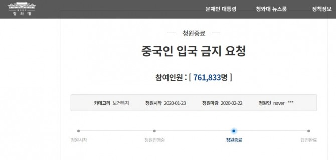 이미지 확대보기23일 청와대 국민청원에 따르면 중국인 입국 금지 요청 청원이 지난 22일 76만1833명이 참여해 종료됐다. 국민청원은 국정 현안 관련, 국민들 다수의 목소리가 모여 30일 동안 20만 이상 추천 청원에 대해서는 각 부처 및 기관의 장, 대통령 수석·비서관, 보좌관 등 정부와 청와대 책임자가 직접 답하는 제도다.