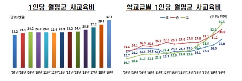 사교육에 참여하지 않은 학생까지 포함한 초·중·고 전체 학생의 1인당 월평균 사교육비는 32만1000원으로, 지난해 보다 3만 원 올랐다. 전년 대비 증가율은 10.4%로 역대 처음으로 두 자릿수 증가세를 기록했다.