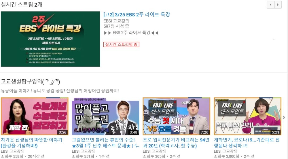 EBS는 학생들이 가정에서도 손쉽게 학습흐름을 유지할 수 있도록 지난 23일부터 2주간 초등 1~2학년 대상 TV방송(EBS2), 초3~고3 대상 라이브특강을 오전 9시부터 오후 4시까지 제공한다.
