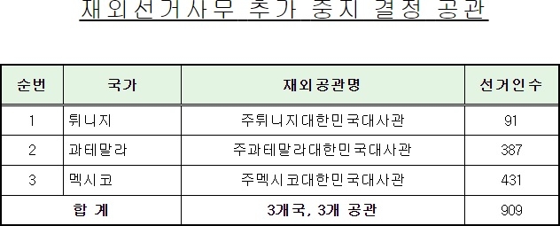 중앙선관위 멕시코⸱튀지니⸱과테말라 재외선거사무 중단