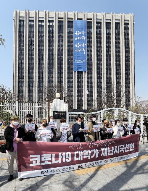 이미지 확대보기26개 대학 총학생회 전국대학학생회네트워크(전대넷)는 6일 서울 종로구 정부서울청사 앞에서 기자회견을 열고 이 같은 내용을 골자로 한 '코로나19 대학가 재난시국선언문'을 발표했다.