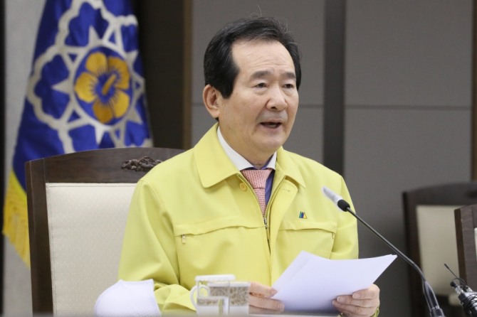 정세균 국무총리는 11일 서울 세종대로 정부서울청사에서 코로나19 중앙재난안전대책본부 회의를 열고 “신중한 논의 끝에 무단이탈과 전화불응 등 지침을 위반한 자가격리자에 한해 전자손목밴드를 착용하게 하는 것으로 결론을 내렸다”고 밝혔다.