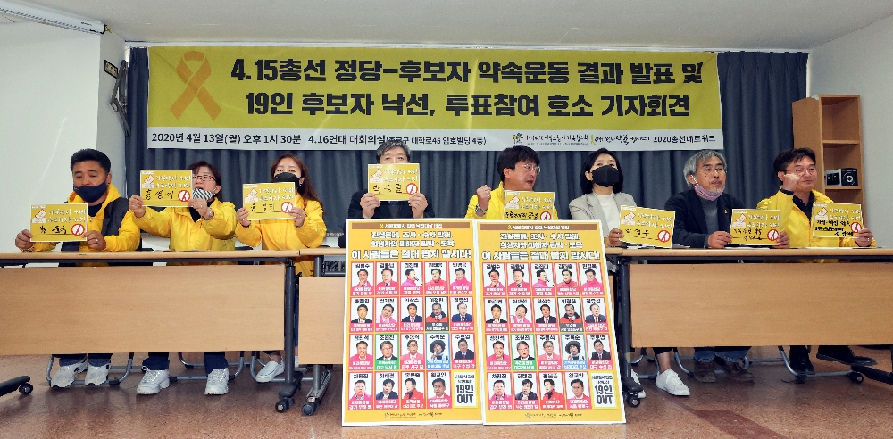 이미지 확대보기세월호 유가족 단체가 제21대 총선을 이틀 앞둔 13일 기자회견을 열고, 총선 후보자 중 19명을 반드시 낙선시켜야 할 대상으로 지목했다.