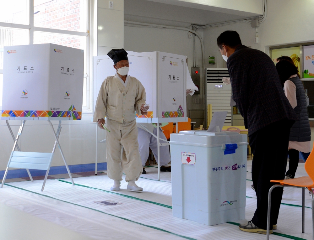이미지 확대보기4.15 총선 투표일인 15일 오전 경남 하동군 청암면 묵계초등학교에 마련된 투표소에서 유건을 쓴 청학동 주민이 투표를 하자 선거 관계자가 정중히 인사하고 있다. 사진=뉴시스 신종 코로나 바이러스 감염증(코로나 19) 확산 사태로 대통령 선거 일정이 뒤집혀버린 미국과 달리 한국은 예정대로 4·15 총선을 치르고 있다고 AP통신이 15일 보도했다.