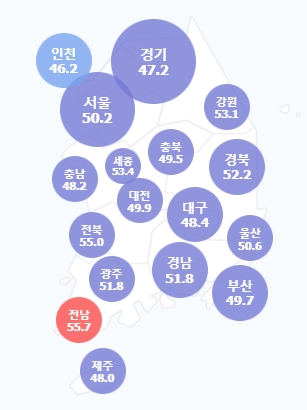반면에 가장 투표율이 낮은 곳은 46.2%의 인천으로 꼽혔다.