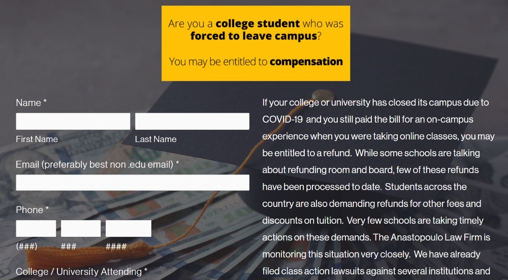 웹사이트에 따르면 "만약 대학이 당신의 선택권과 등록금 환불에 대한 기대를 충족시키지 못한다면 집단소송에 참여할 수 있다“며 ”당신이 (소송) 서류를 작성하기만 하면 우리의 변호사 중 한 명의 연락을 받을 것"이라고 안내하고 있다.