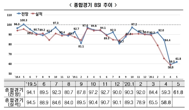 27일 한국경제연구원이 매출액 600대 기업을 대상으로 기업경기실사지수(BSI)를 조사한 결과, 5월 전망치는 61.8에 불과했다.