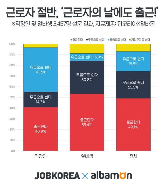 직장인은 40.9%, 알바생 53.4%로 알바생이 더 많이 출근하는 것으로 나타났다.